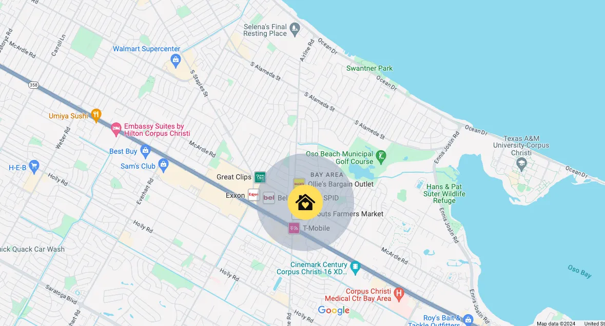 Location is considered the "Bay Area". The Bay Area is a charming residential district situated between Corpus Christi and Oso bays. It features scenic waterside parks such as Cole Park, which boasts a fishing pier and jogging trail, and the Suter Wildlife Refuge, which is known for birdwatching. Visitors can enjoy a range of dining options, including casual Mexican eateries, trendy tapas bars, and cozy Italian restaurants, as well as quaint cafes and relaxed pubs. Additionally, South Padre Island Drive is home to discount stores offering clothing and home goods.